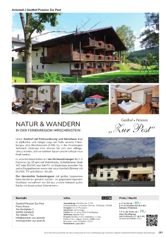 info@pension-zur-post.de Freizeit: Freibad: 4 km, Hallenbad: 11 km, inkl. Frühstück 2 P. ab € 90,-